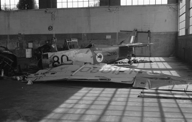 She crashed and was destroyed in the Rakaia River during a low-level training sortie on 11 August 1973. Sadly, acting Pilot Officer Antony Schmidt was killed in this accident, and instructor Flight Lieutenant John Woolford suffered serious injuries. The RNZAF allowed some components of this airframe to be used in the restoration of NZ1058.